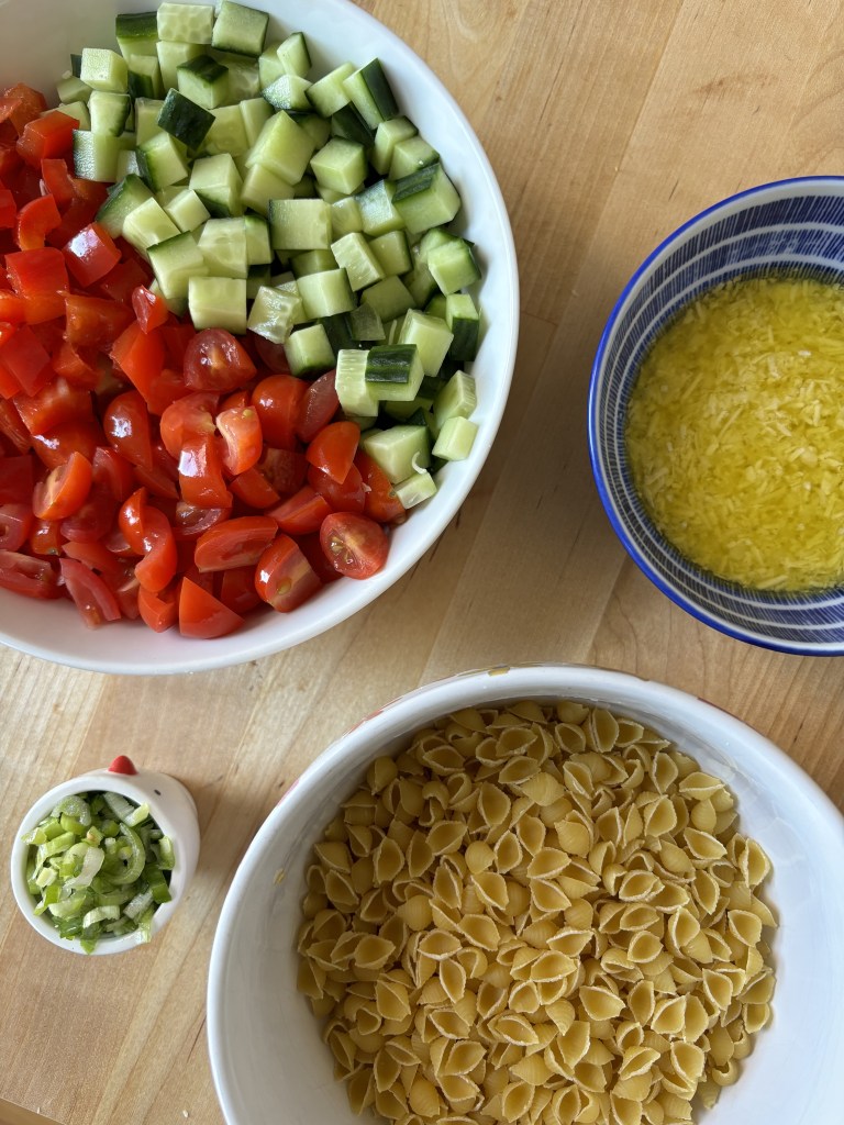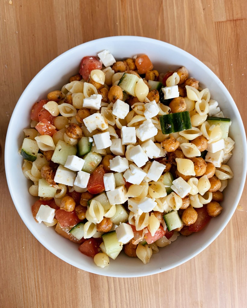 - To a large bowl, add cooked pasta, chickpeas, veggies, avocado, feta and dressing and toss well to combine.
