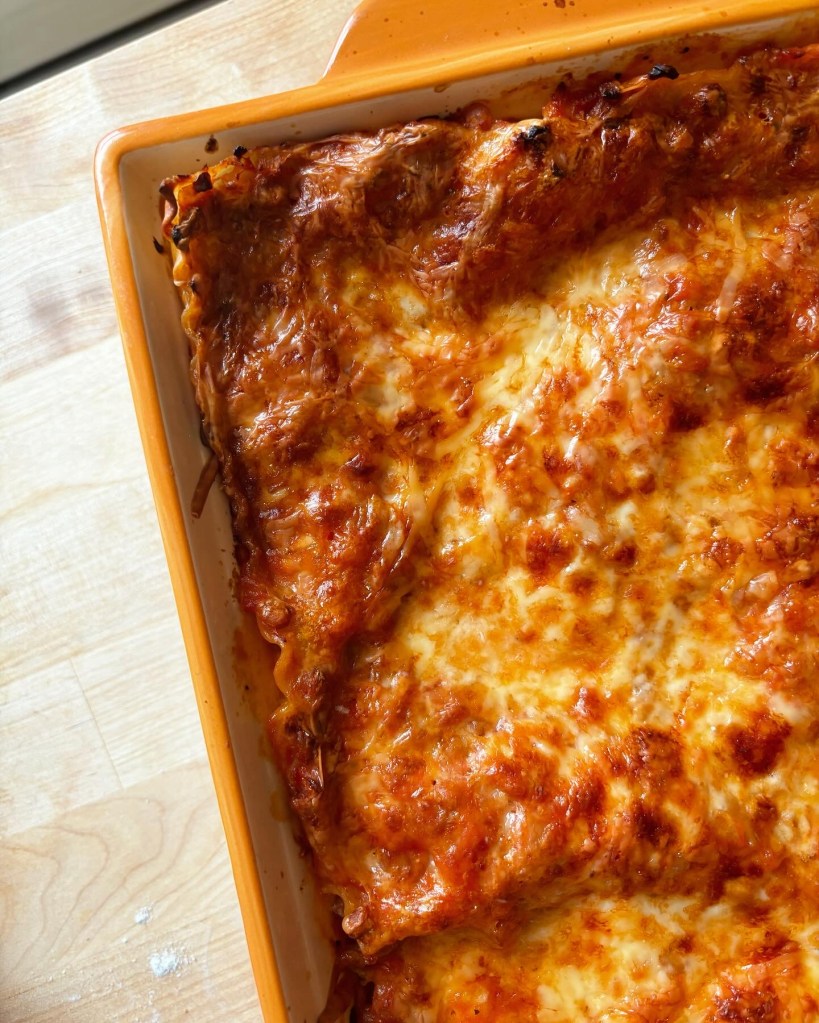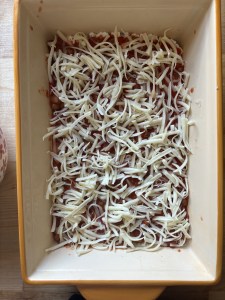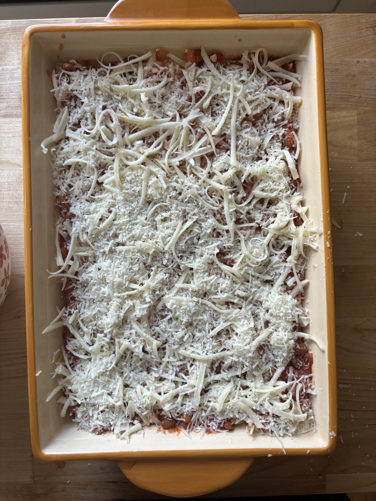 The assembly process is where it gets fun! I go in first with some sauce so the noodles don’t stick to the pan. Then I do the following 3 times: noodles, cottage cheese/ricotta, sauce, mozzarella. Then top with some parm if you have it on hand!