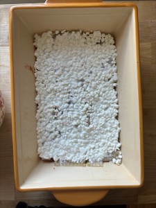 - Bake for 30 minutes (ideally covered) at 300, then raise temperature to 400, remove covering and bake until top is browned (10-15 minutes).