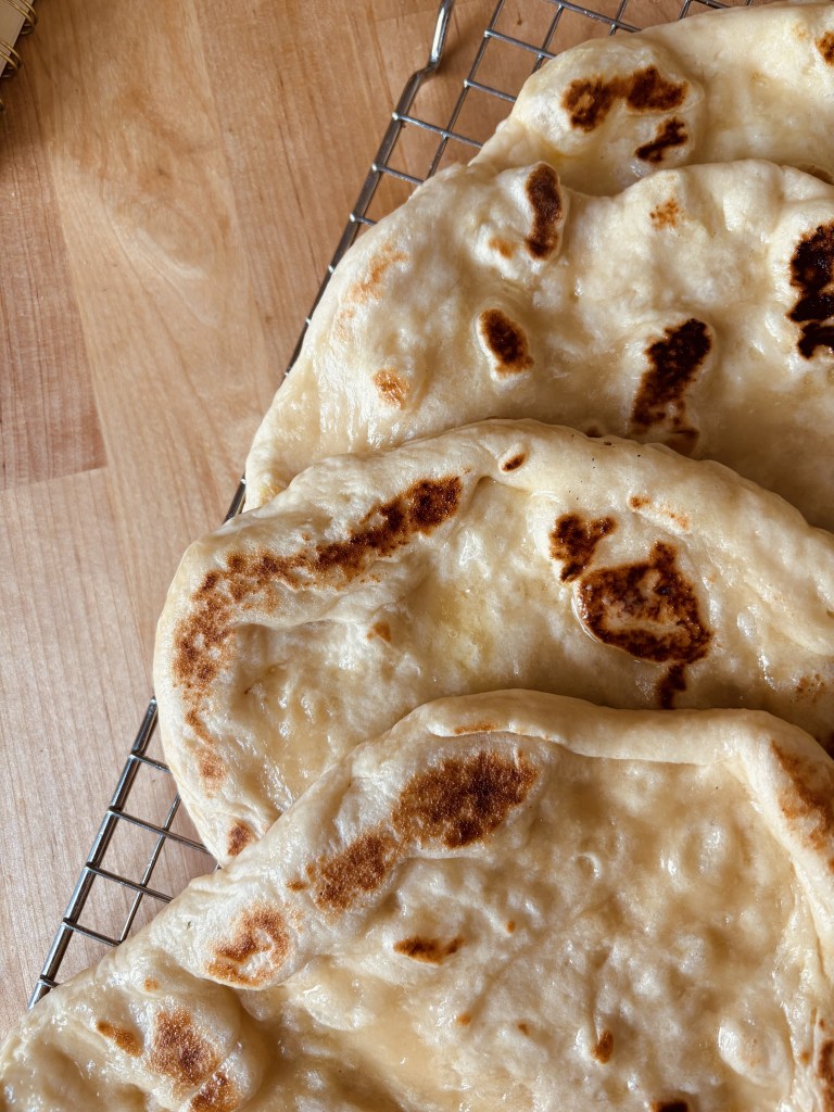 - After taking each naan off the heat, brush with garlic butter for extra deliciousness!