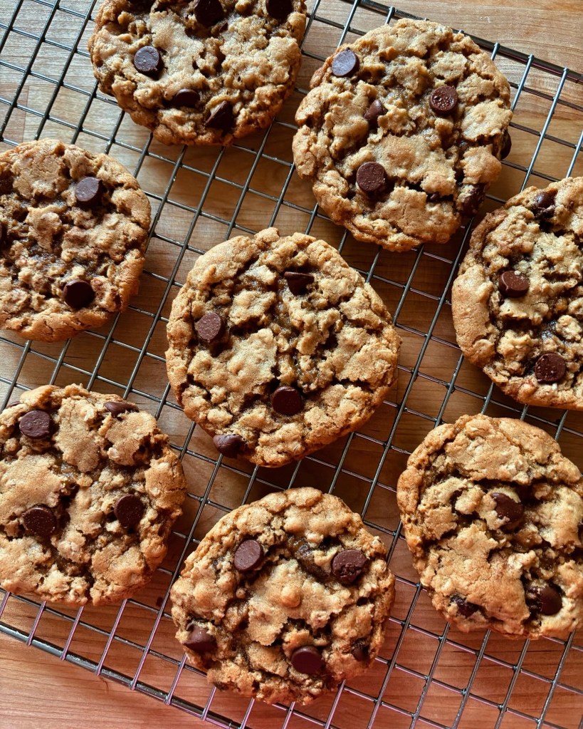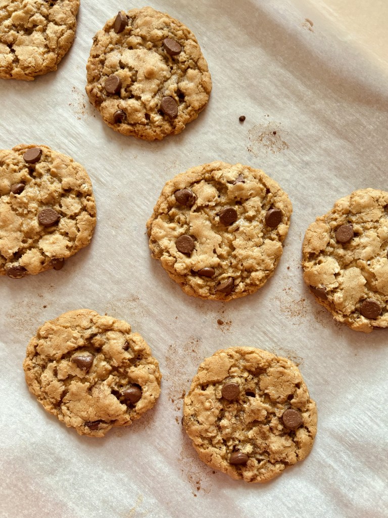 These are in fact my favourite cookies out there. They are so chewy from the oats but they’re still thin and crispy. Something about oatmeal chocolate chip cookies is just warm and comforting. I like adding a dash of cinnamon to mine to enhance that warm cozy deliciousness! Another way to level these up is using brown butter instead of just melted butter, or add in some tahini, as I say in every recipe!