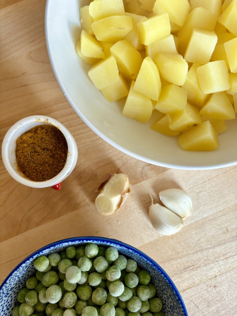 - Heat pan over medium heat. Add butter/oil, onion, peas and spices, cook until onion are softened. Add potatoes and stir until well combined.