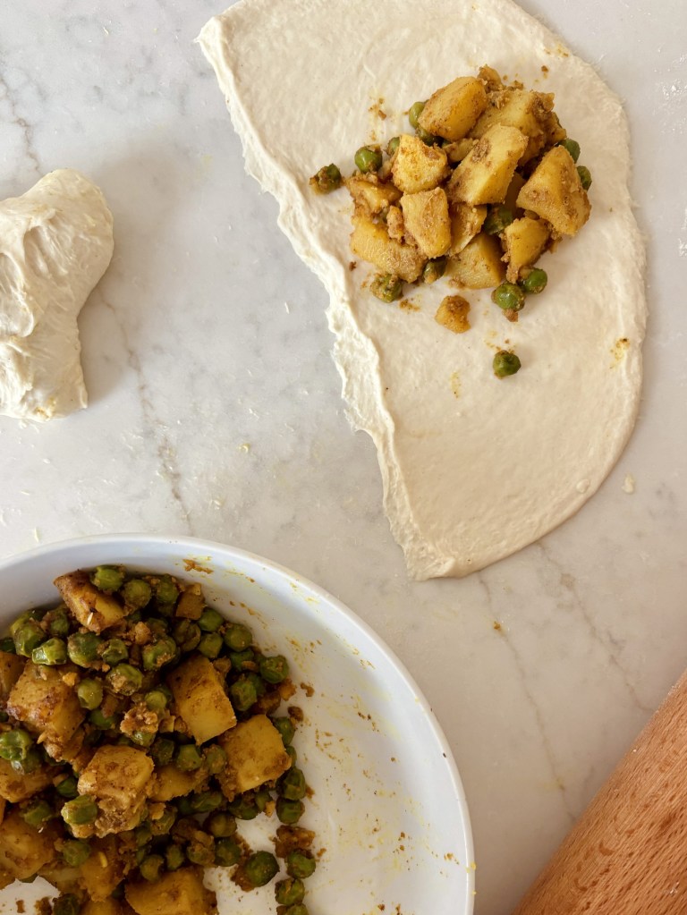 The wrapping of these gets a bit complicated. To start roll out a circle of dough and cut it in half. Spoon some filling into the middle of the semi circle, (the center of this straight line will become the point of the triangle). Take one corner and fold it over to the top of the other side. Then repeat on the other side. You should now have a triangular shape. Pinch all the seams sealed. You now have a samosa!